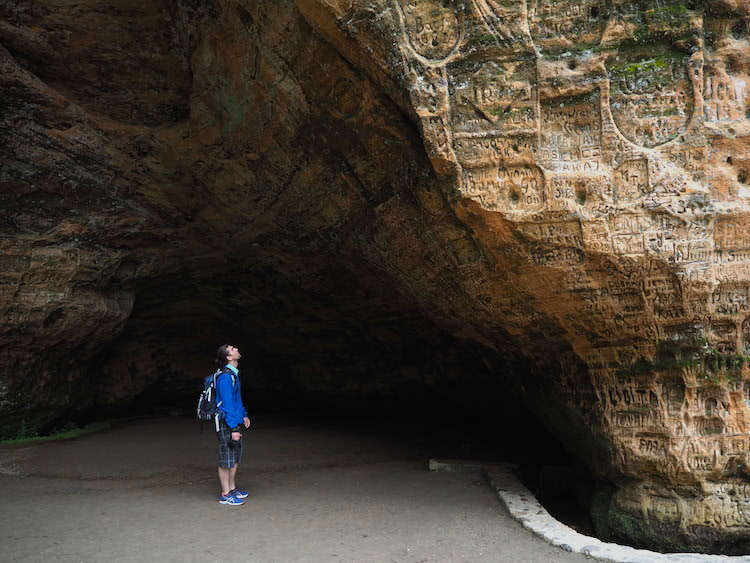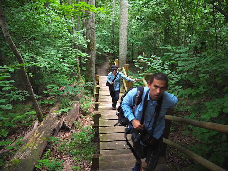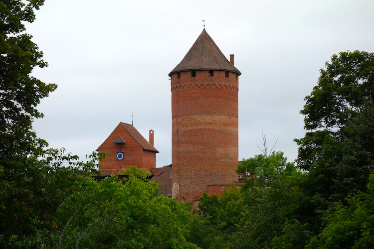 We walk too in Gauja National Park with its steep forested hillsides, medieval castles, a large cave with 16th-century graffiti and the swift-flowing, icy cold Gauja River. On the train to Sigulda (where we start our walk), we see white cranes in the fields and people out in the forest picking berries. Old women in headscarves, long skirts and traditional jackets forage alongside young men in tight, brightly coloured jeans and floral shirts. Sunny yellow wildflower meadows. A vehicle deep in the dark forest, inexplicable and conjuring up the spectre of more sinister times.