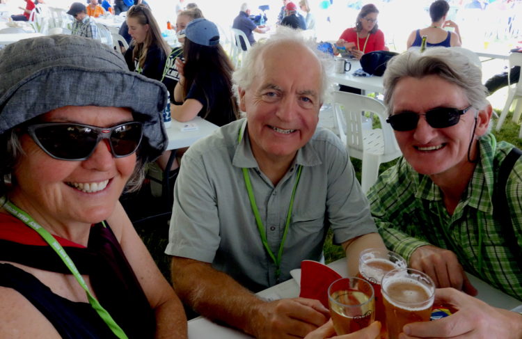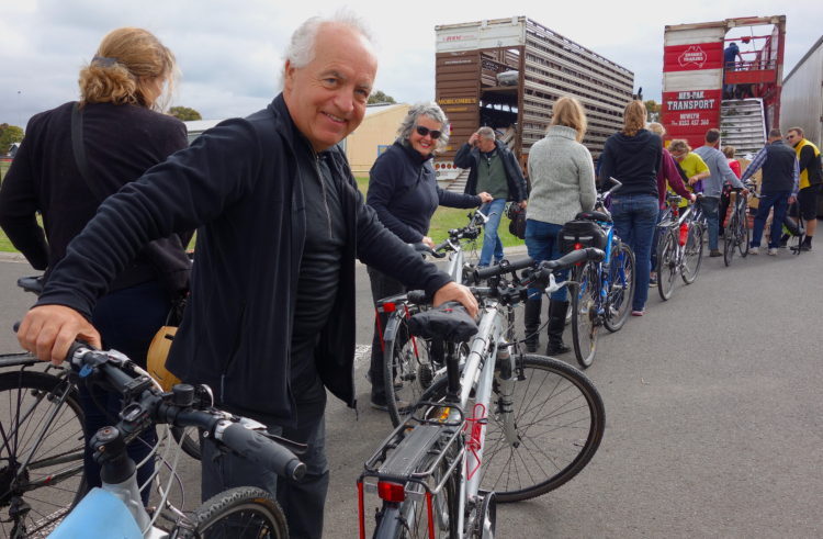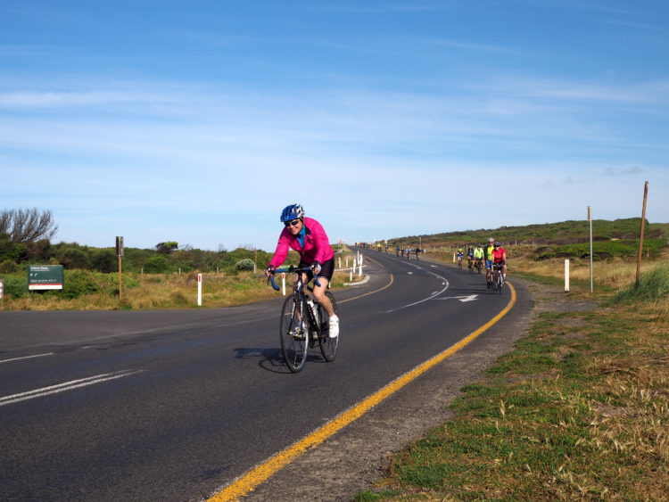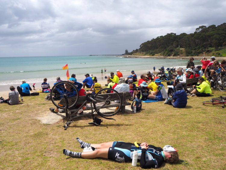 A kamikaze chicken races alongside Michael then, bang, into his front wheel, unsettling both rider and bird. Old weatherboard farmhouses with verandahs. Farmers out by their front gates, watching the slipstream of cyclists ride past. Lunch in the sun on the jetty at Boggy Creek as bemused fishermen return from their morning’s fishing to find their quiet world overtaken by thousands of chattering cyclists.