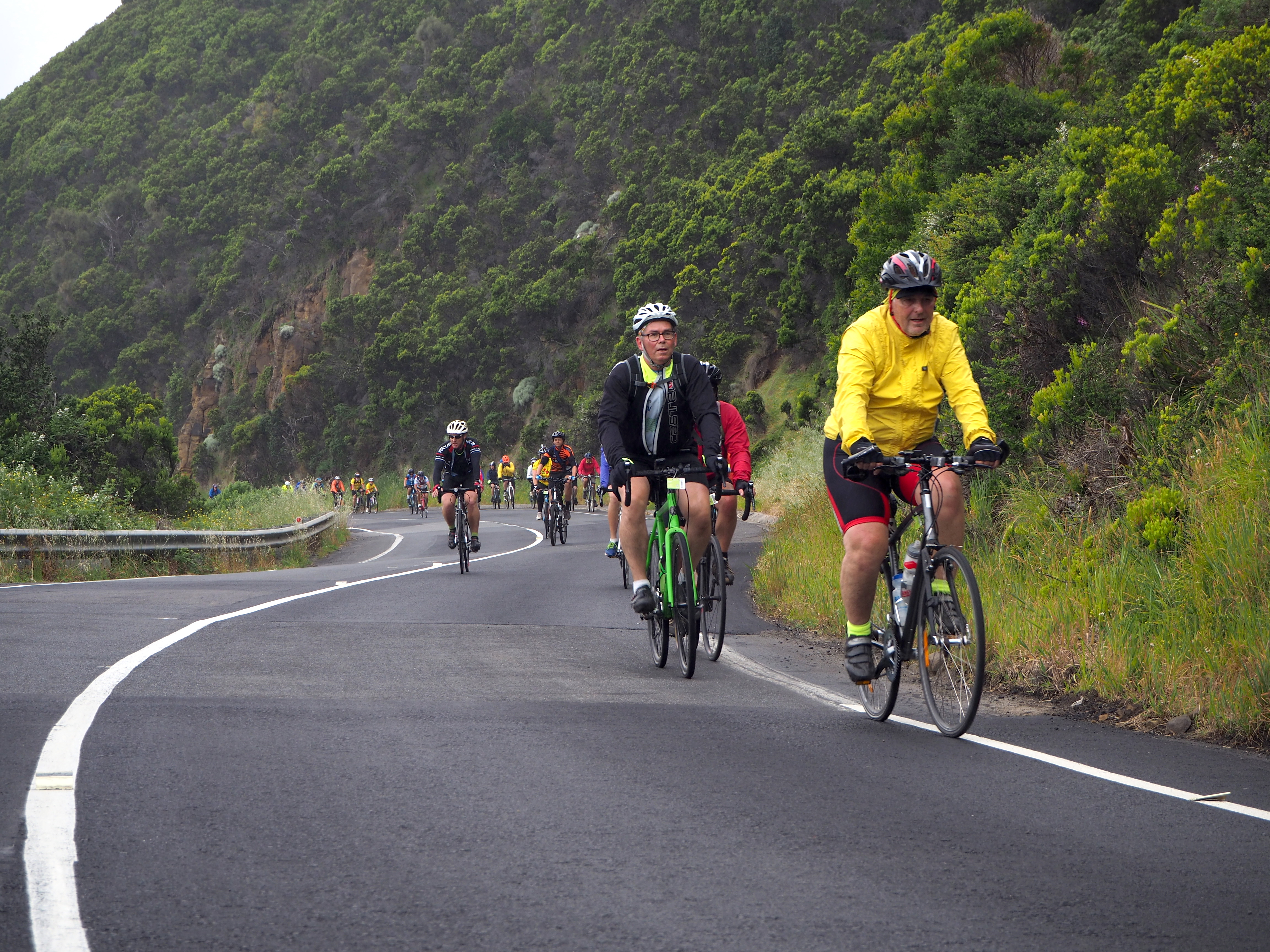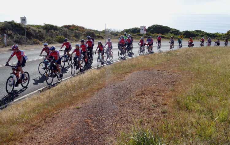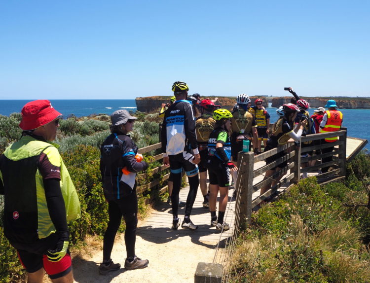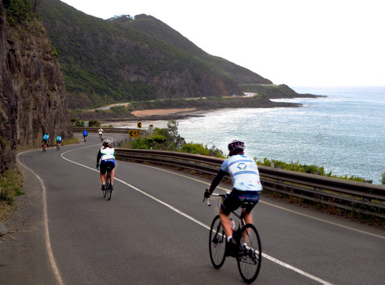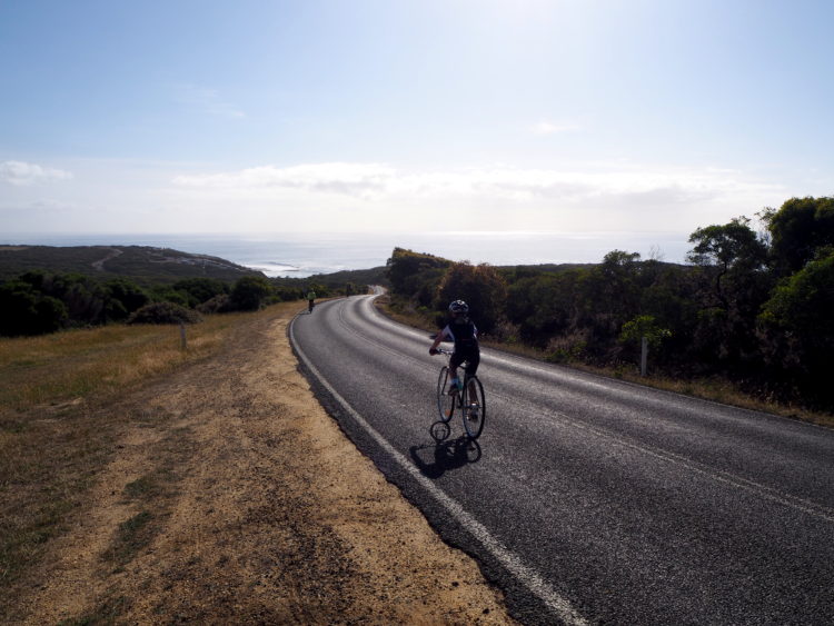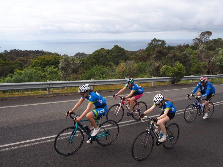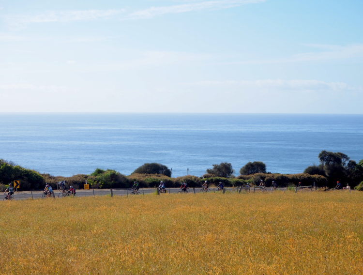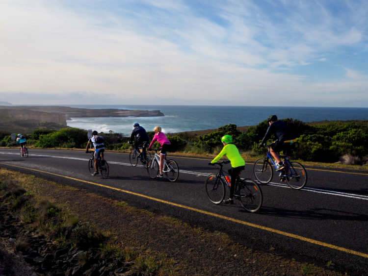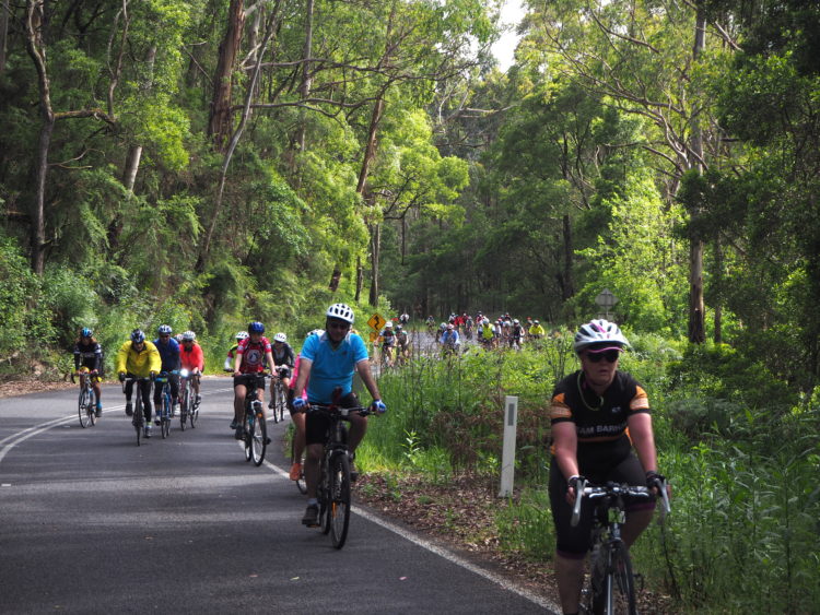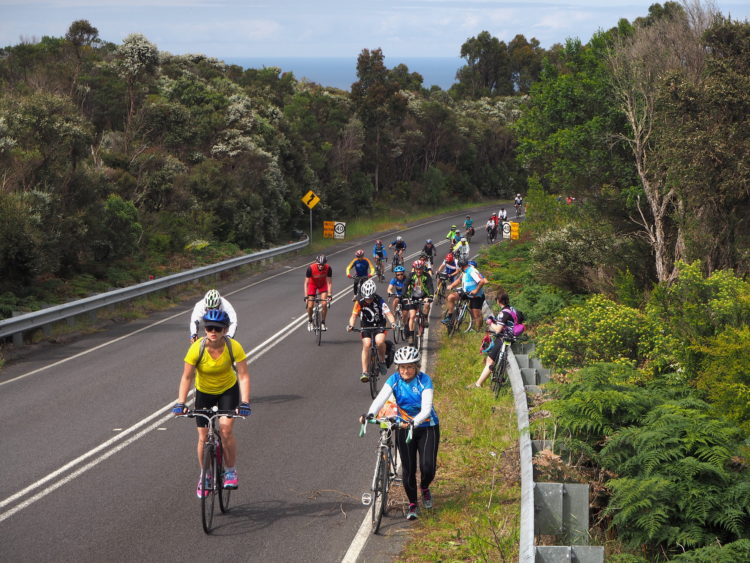 Coasting with the sea on our right and marvelling at iconic landscapes like Loch Ard Gorge and the Twelve Apostles. Until we leave the wild beauty of the southern ocean, ride into the mysterious green of the Otway Forest and start the long, slow 20-kilometre climb up Lavers Hill. Strangers urging each other to keep spinning, the youngest rider only seven years old, the oldest over 80.