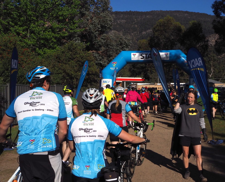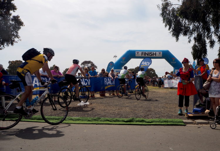 An early and chaotic breakfast at a very unprepared Harry’s Kiosk. The last day of the Great Victorian Bike Ride and by necessity a more prosaic route today, except for the section around Port Phillip Bay and through the coastal towns of Indented Head and Portarlington. Car traffic on the increase and all focus on the road now, rather than on the landscape. Even so, cycling into Geelong and to the end of the ride isn’t an anticlimax. Costumed superheroes and crowds of people with clappers cheer us to the finish post. We cheer for the good-natured camaraderie of the travelling festival that is the ride, the fun we had as a team of four, the weather that favoured us for nine days and for the beauty of the country we rode through.