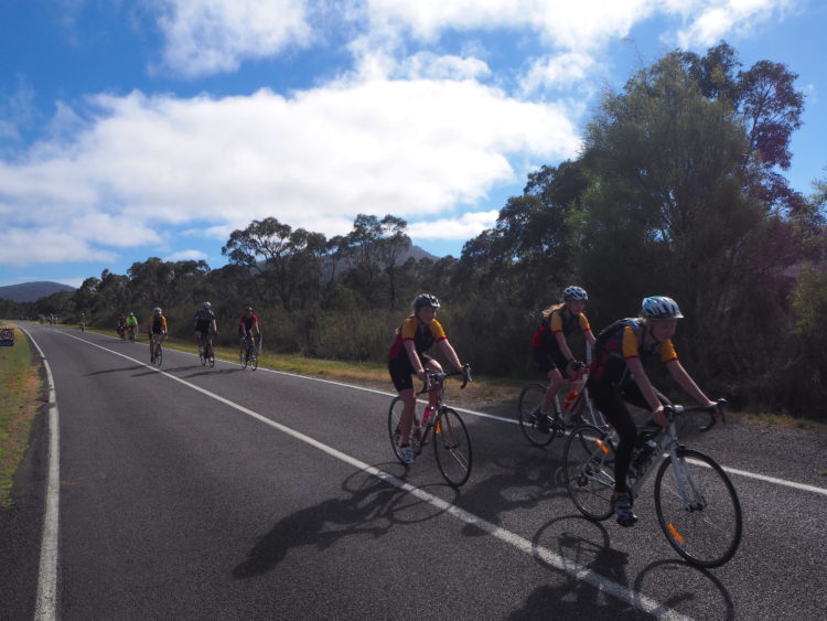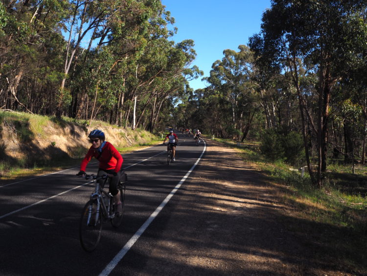 Freewheeling the winding, gentle back roads; a slight tailwind and the sun on our backs. Learning to speak the language of the peloton: car up, car back, passing on the right, rider behind. Hawks hanging in the sky, cockatoos screeching. The volcanic hills of the western basalt plains smoky on the horizon. Some scientists believe that these volcanoes are not extinct, merely dormant. There are aboriginal stories of rocks and fires coming from these mountains and when Major Mitchell climbed one of the volcanoes in 1836, he observed that it looked as if it had been active not so long ago.