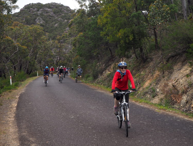The sky clears and the sun shines. Riding in dappled light through tall eucalypt forests and a flowering understory of tea tree, grevillea and grass trees. And then the climb up over Mirranatwa Gap. People off their bikes and walking, boy and girl racers lightning fast on the ascent, us taking it steadily and reaching the top of the pass with gears to spare. A good morale booster for the long climb up Lavers Hill that we know lies ahead in three days. The Grampians (Gariwerd) all the while beguiling, its ancient rock art a secret, its rugged sandstone ridges and mountain peaks dusky red and magnificent.