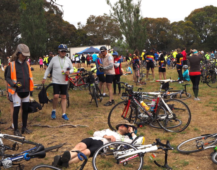 Mares’ tail clouds clear to a bright blue sky. The afternoon warms. The CWA, the Bowls Club and the Football and Netball Club are out in force, welcoming riders and raising funds for community projects. The population of Mortlake is 1,200. For one night the town swells to accommodate more than 5,000. The normally deserted after-dinner main street swarms with cyclists keen to linger in the balmy evening after the day’s 90-kilometre ride.