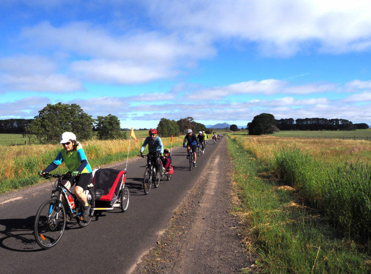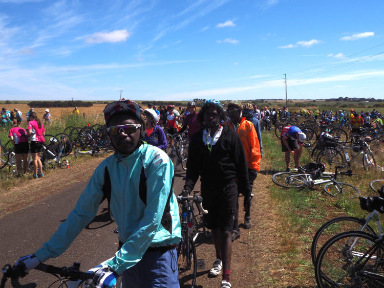 Through almost abandoned country towns, crows calling in a dirge-like chant as we cycle through the intersection where five young people and a truck driver tragically lost their lives five years ago. On to Mortlake, our destination for the evening, small children lined up outside the primary school to wave the strange horde of riders into town, older children with clipboards furiously noting down observations for an assignment as rider after rider sails past.