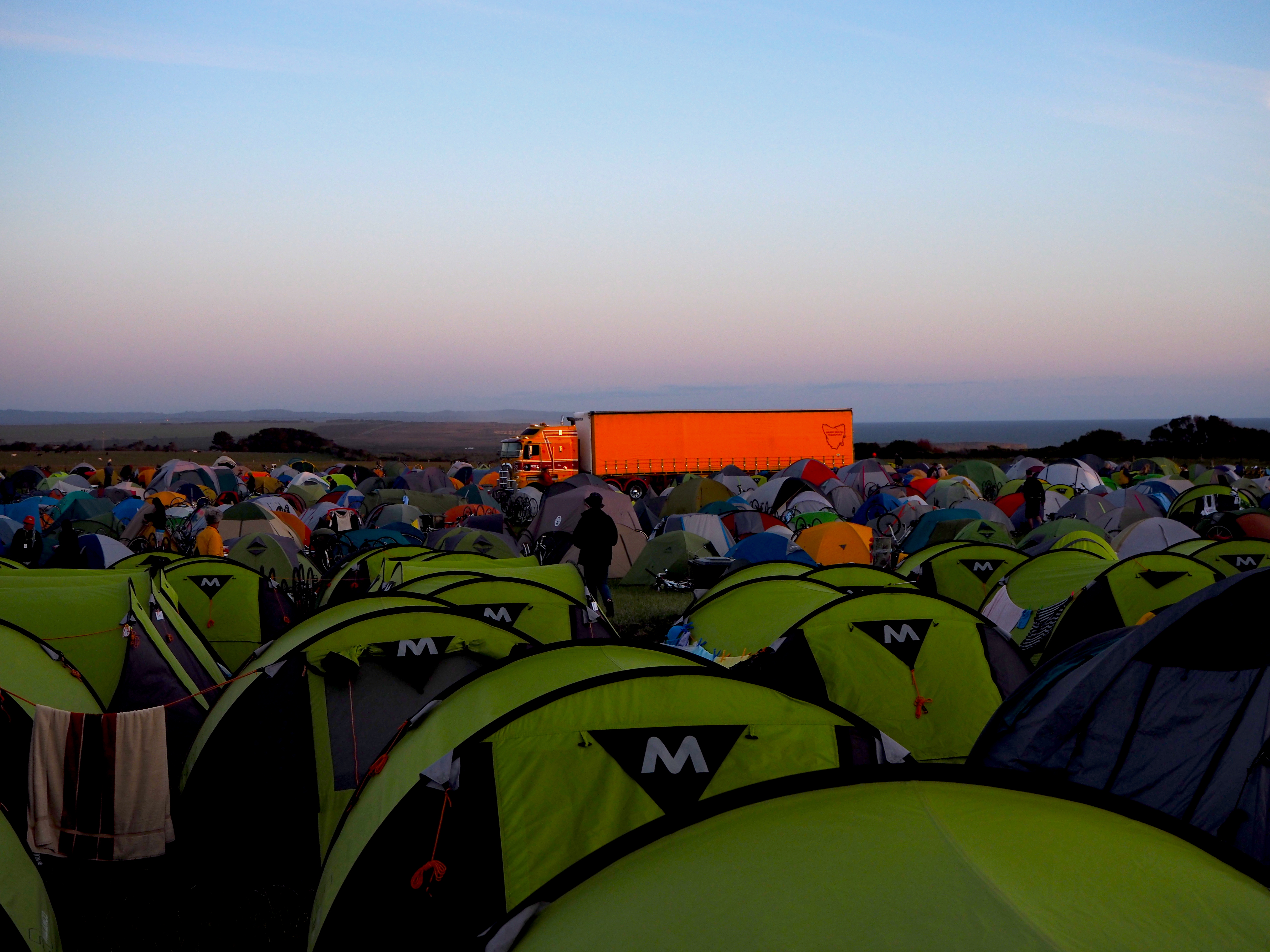 At Lorne, we are held again until all riders are safely in. Cyclists and hungover schoolies swell the pedestrian traffic on the foreshore until the all-clear is given and, back on our bikes, we join the never-ending procession of cyclists riding through town and spinning eastwards. Bicycles of all persuasions; slick carbon fibre road racers, hybrids, dragsters, steam-punk machines, mountain bikes, fold-up bikes, electric bikes, tandems, a quint (5-person bike), and bicycles towing trailers where young children sleep. On past Eastern View, Aireys Inlet, the Split Point Lighthouse and Anglesea. The sea, always the sea. Surfers out riding the waves and beyond them an infinity of blueness. To Bellbrae and another grassy paddock, another gentle night. Near our tent, two ukulele players and a small group of singers gather in a circle and sing lullabies long into the deep dark night.