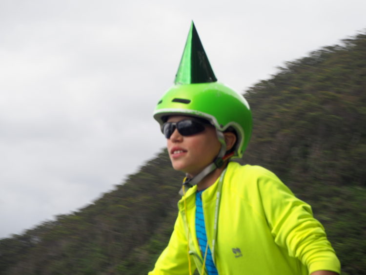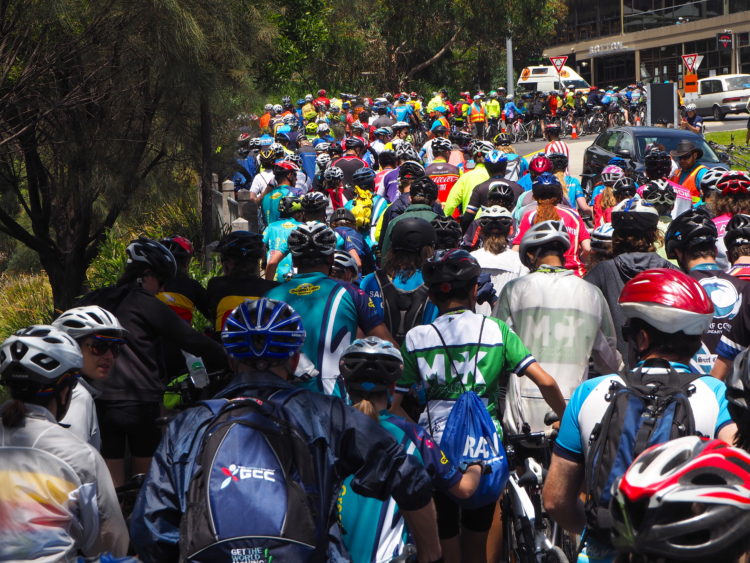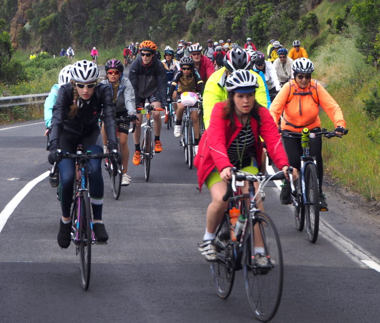 Of the 4,200 cyclists, 1,800 are school students and their teachers and parents. The rest are young families, road racers, eccentrics, loners who feel comfortable in the anonymity of such a crowd and people like us with time and energy on our side. The young riders are tenacious, even when the hills are arduous. The schools say their cycling program and participation in these Bicycle Network events teach their students’ life skills including teamwork, resilience and leadership. You can see the truth of this in their attitude and in their spirit.