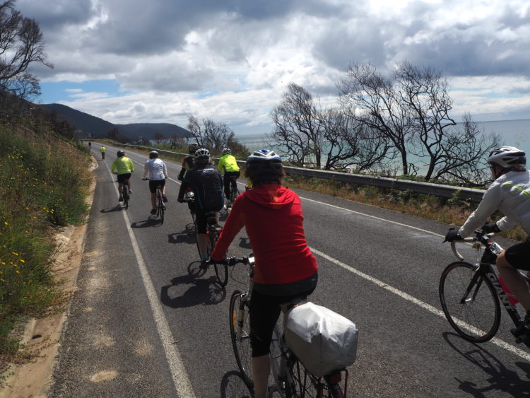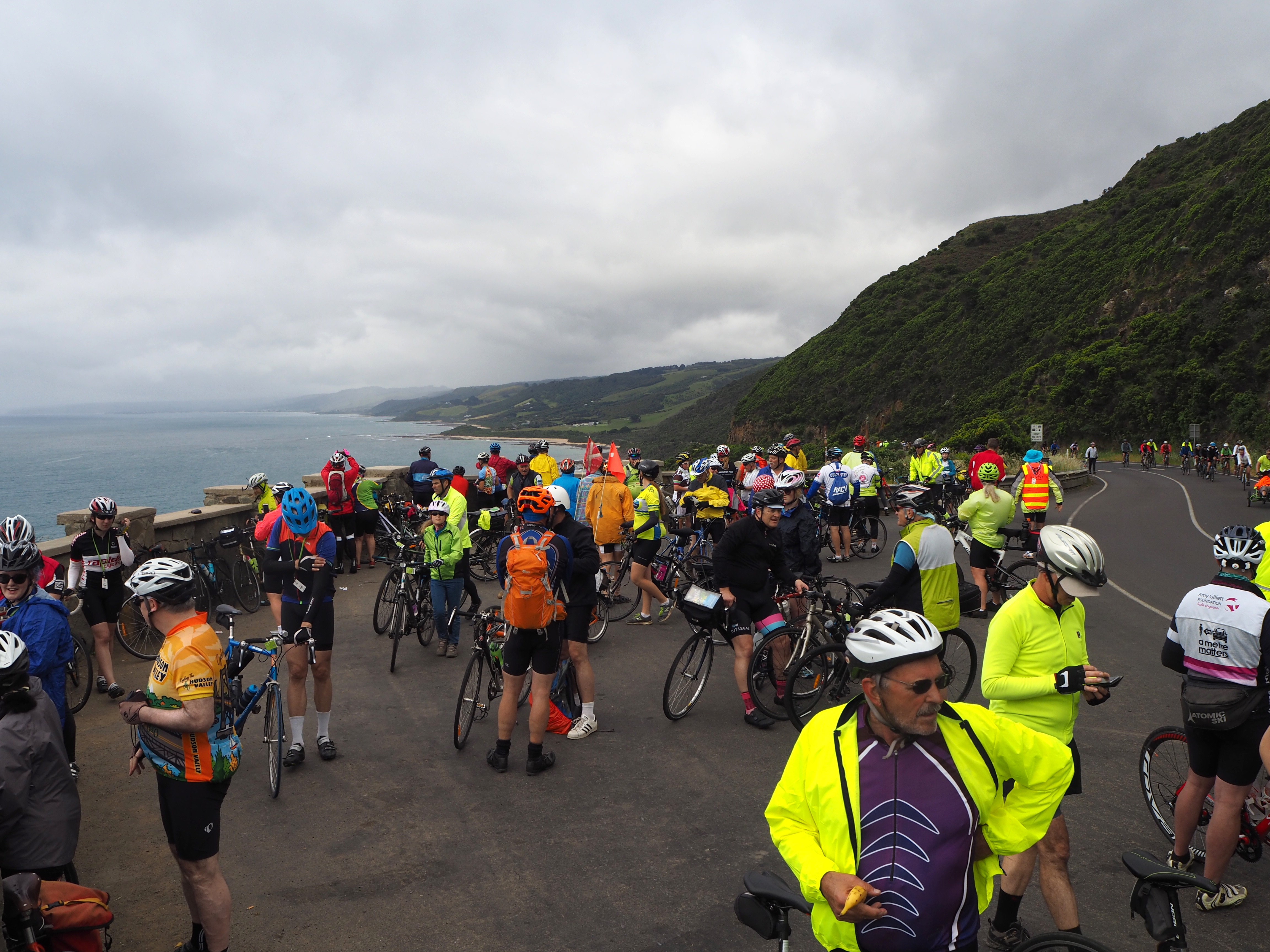 A sparkling start to the day. The sea shimmering, the sky clear blue. Until the weather from the cloud forests comes in carrying rain, though not enough to dampen the spirit of the riders. We are all held at Apollo Bay until 8 am and then released en masse to ride the Great Ocean Road, closed to car traffic all the way to Lorne. A rare pleasure. The sea soon turquoise. The vistas sublime. Hugging the coast, the waves breaking on the shore, riders talking their way up and down the hills – riders up, passing on the right, merging – a chorus, a slipstream, the wind at our backs, the hills easy in the conditions, the cadence on song as we pass through small coastal towns, the haunts of our youth. Skenes Creek, Wongarra, Kennett River, Wye River. We stop at the Wye River General Store for coffee and an excellent pan chocolate, the only sobering note to an otherwise pitch-perfect morning being the bushfire ravaged slopes, now cleared of trees, and the landslides that have closed part of the road.