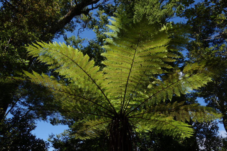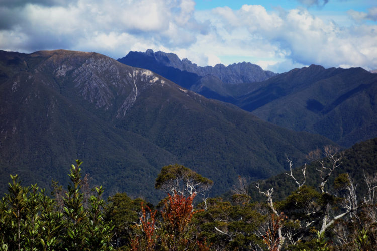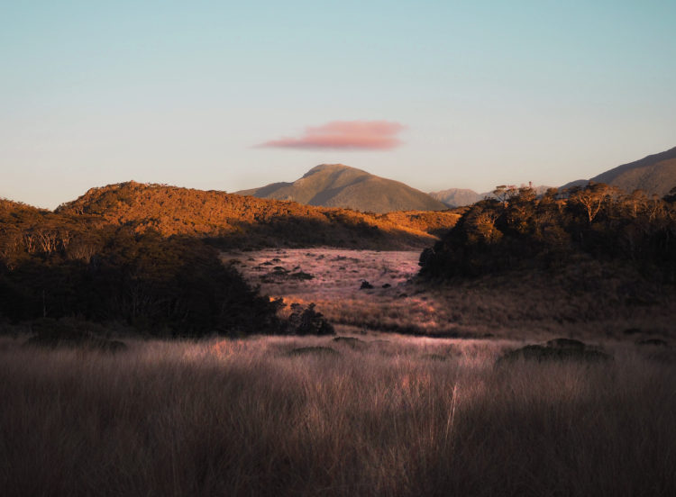 Across the river and into the trees; a rainforest of beech and slender tree-ferns. Deep, lush, vine-entangled gullies, dusky pink blooms, pandanus and flowering manuka. The strange, sweet songs of unknown birds. The red shimmer of kaka in flight, a fantail coquettishly spreading its black and white fan, rifleman birds spiralling up around tree trunks. The main climb of the Heaphy Track is on day one, today. It’s a gradual ascent up to Flanagans Corner (at 915 metres), with views out across mountain peaks, waterfalls and mossy springs, through to Tasman Bay.