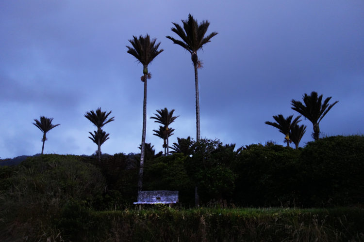 A splendidly sunny morning. Coastal forests and palm-fringed beaches. The stout, green-trunked nīkau palms shadowed on the sand, their bright red fruit food for the wood pigeon. Waves rolling in from the Pacific and breaking on pink granite beaches. All-day the sound of the sea and the scent of the sea.