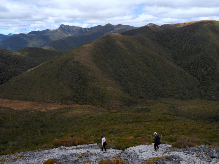 A day of extraordinarily varied landscapes beckons. We climb up through an enchanted alpine garden of pale lichen, velvet cushion plants, white and yellow daisies, sundews and stunted, gnarled trees bearded with moss. Scrambling up scree slopes to the summit of Mt Perry (1,238 metres) we look out across range upon range of rugged mountains. The Aorere River winds its way through a green valley, the sea washes into Golden Bay and, with binoculars, we can see Cook Strait and the North Island shimmering on the horizon. Ridges and peaks with names like the Dragon’s Teeth and the Drunken Sailor. A chorus of birdsong; skylarks, tui and bellbirds. Stoat traps laid at frequent intervals in an attempt to protect the endangered rock wren and other small native birds. The giant nocturnal Powelliphanta, the largest carnivorous snail in the world. An occasional old Heaphy Track milepost, rusted and illegible, sculptural now rather than for wayfinding.