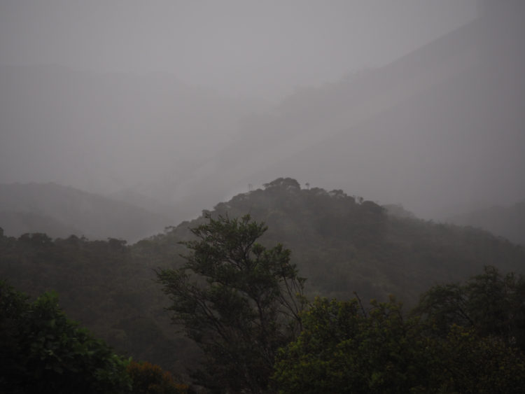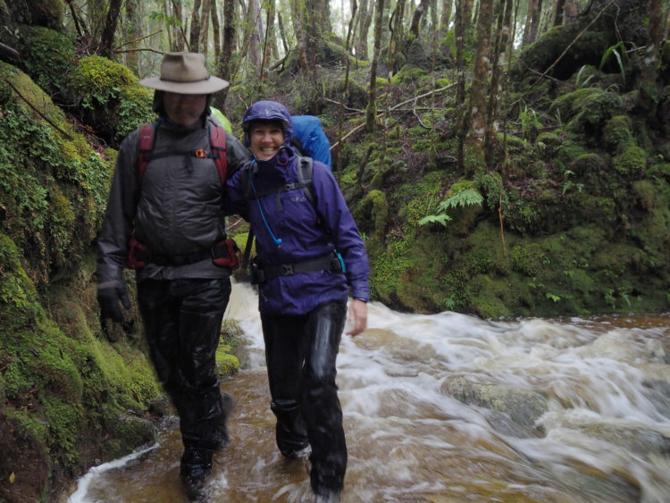 All night rain hammers the tin roof and lightning splits the sky. At first light, there is more rain, driving horizontal rain. Wild, west coast weather. The first walkers to set off are back within 15 minutes, the creeks too treacherous to cross. The warden cautions us to wait until the water level subsides. Rain blows in sheets up the valley and cascades down the mountainsides. The windows of the hut become waterfalls.