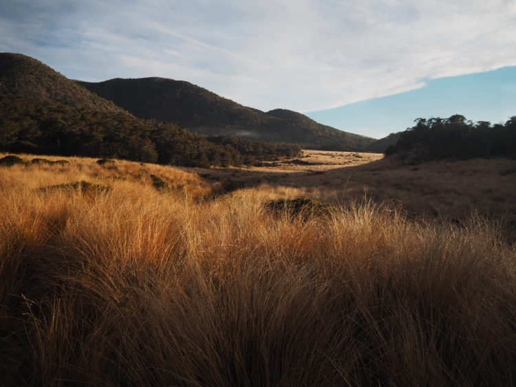 A night at Perry Saddle amongst tussock downs still flecked with summer wildflowers and backed by mountains. A heavy mist rolls in and contains our world to a timber hut and its verandahs. All else lost in the fog. In the damp melancholic darkness, a morepork calls. In the dead of night, we hear the distinctive, sustained cry of a male kiwi.