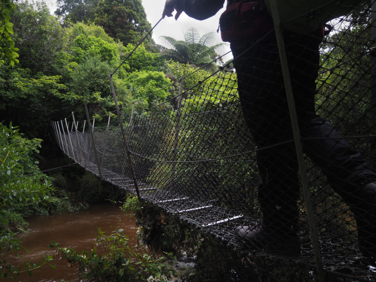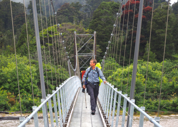 A seam of glossy black coal runs alongside the track. The rain clears to mist as we descend through cloud forest to Lewis Hut, bedraggled but buoyed by adventure. The Heaphy River has broken its banks and is lapping at the footings of the hut. By the time we have something to eat, the water has receded enough for us to walk on, across the suspension bridge high above the wide, swift-flowing river and into a mystical world. Floating islands of flowering flax. Mist-shrouded, ancient, red-flowering rata forests, lofty palms and precipitous limestone cliffs with bright birds flying high up into the green canopy. Tuis calling.