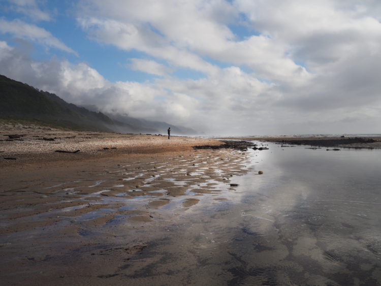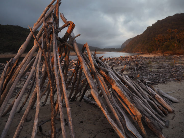 The sky clears and the sun shines. We follow the Heaphy River to the sea. Its sandy estuary is strewn with logs washed down the river and now lying bleached and silver on the shore. Someone, a walker perhaps, has created sculptures from the driftwood, making the beach cinematic in the soft afternoon light. Sooty oystercatchers, cormorants and terns scurry across the sand. Heaphy Bluff to the north and Heaphy Beach arcing away to the south, the river and the sea silken and shimmering at sunset. Venus, the first evening star, is bright in the sky. A crescent moon hangs low over the water.