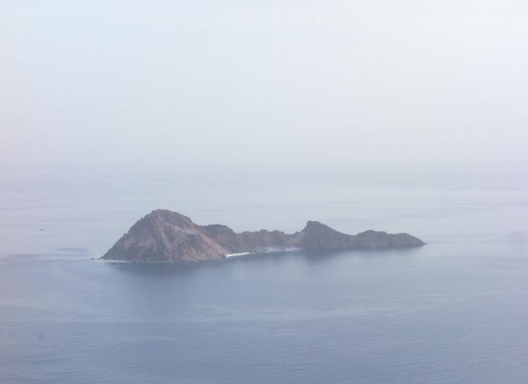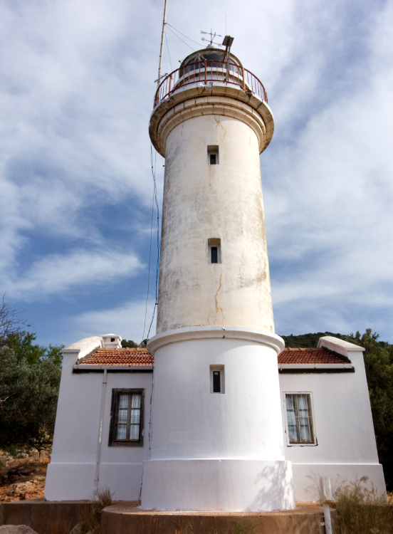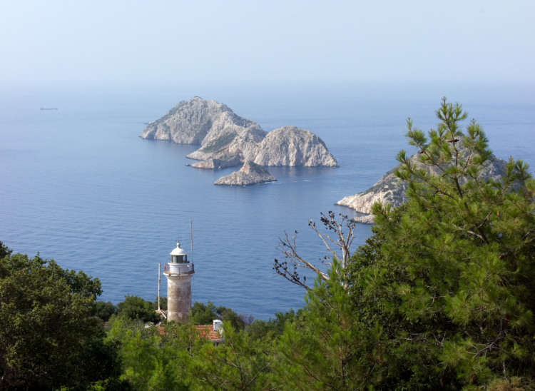Cutting across the isthmus, past pomegranate orchards and olives groves and up the hill to the squat, white, deteriorating Gelidonia lighthouse. Views across the silky blue sea to the barren Five Islands. Container ships plying the water far off-shore.