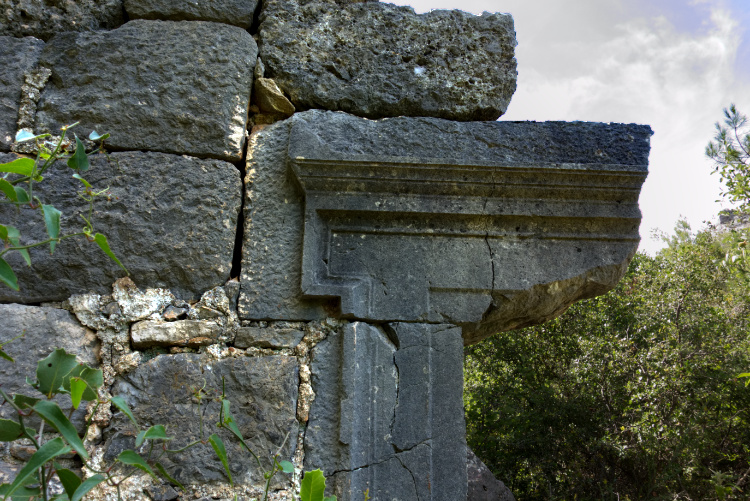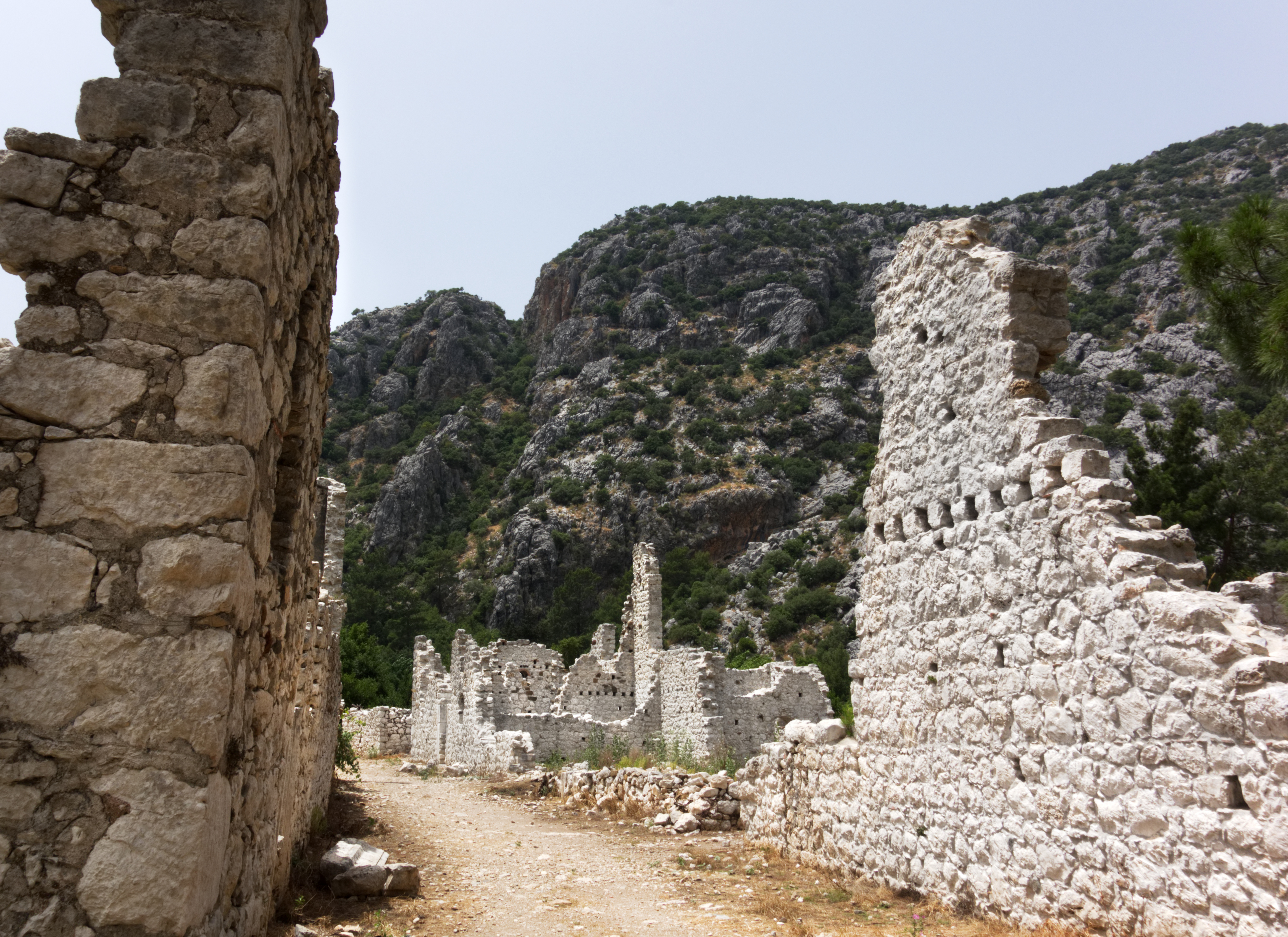 Climbing 750 metres through verdant woods on a path once used by camels taking provisions to the high summer pastures. On one side of the pass are stonewalled enclosures, abandoned because the changing climate means there is no longer enough rainfall to sustain grazing. Across the dry grassy pass and just below the ridge of Musa Daği is another yayla, this one with goats and a goat herder who has set up a ramshackle cafe selling çay, Turkish coffee and fresh orange juice. Above us on the hilltop is the lost city of Upper Olympos (Phoenikos). Fragments of columns, tombs and a temple. Baths, a chapel and graves.