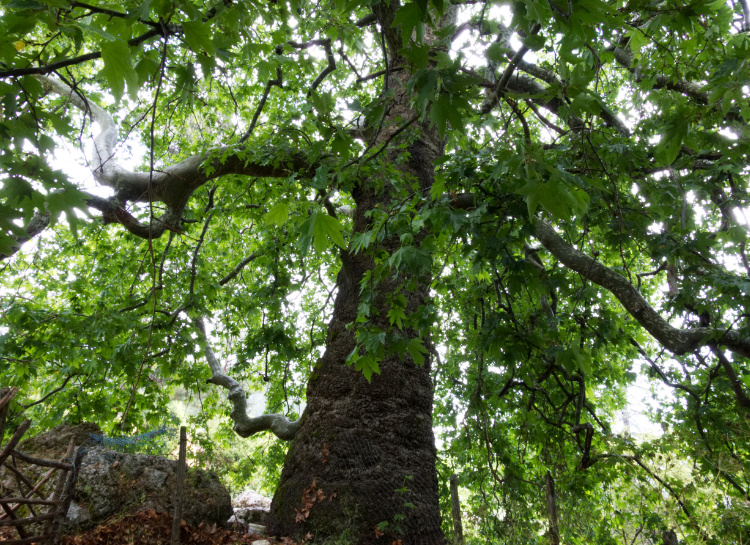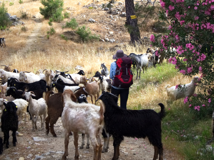 After yesterday’s rain, the sky is so clear we can see for miles. Out past islands way offshore. Climbing through pine forests and, higher up, cedars. Deer tracks in the dark red soil. Yörük nomads working their high summer pastures. Goats, cows, a donkey and a young woman dressed as she might have been 100 years ago. The harsh musicality of a goat herder’s call across the valley. Walnut and mulberry trees. Meadows of mountain sage, the scent of it in the air. Birds singing in the bright green plane trees. Weaving our way between rocks and strewn boulders. The sun gentle. A coolness in the breeze.