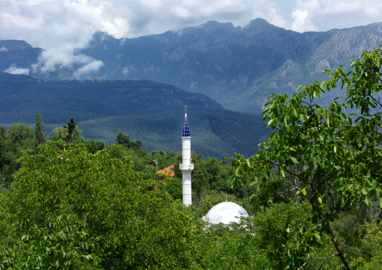 Snowdrifts on the northern slopes of Mt Olympos. A glittering, silver and white mosque visible in the distance. The midday call to prayer drifting up to us as we zigzag down the hillside. The clouds lifting to reveal mountain ranges, the green Kemer valley and a purple haze of wildflowers. Bountiful orchards, poplar plantations and walnut trees laden with green nuts in the village of Yukari Kuzdere. Nobody much lives here in winter and even this late in spring the village is still almost deserted.