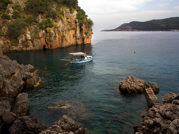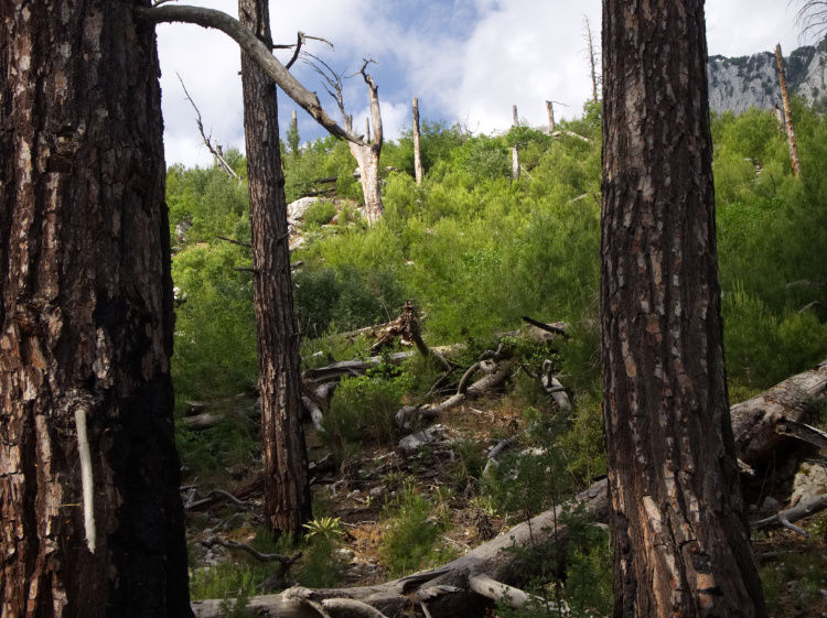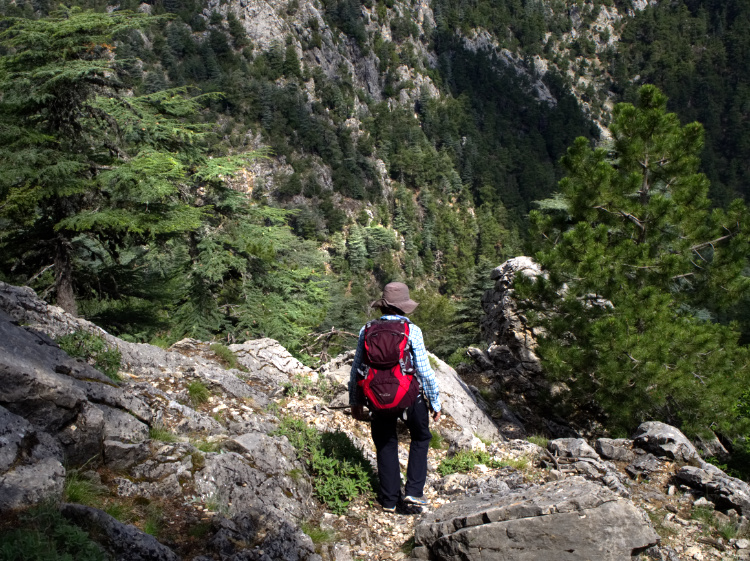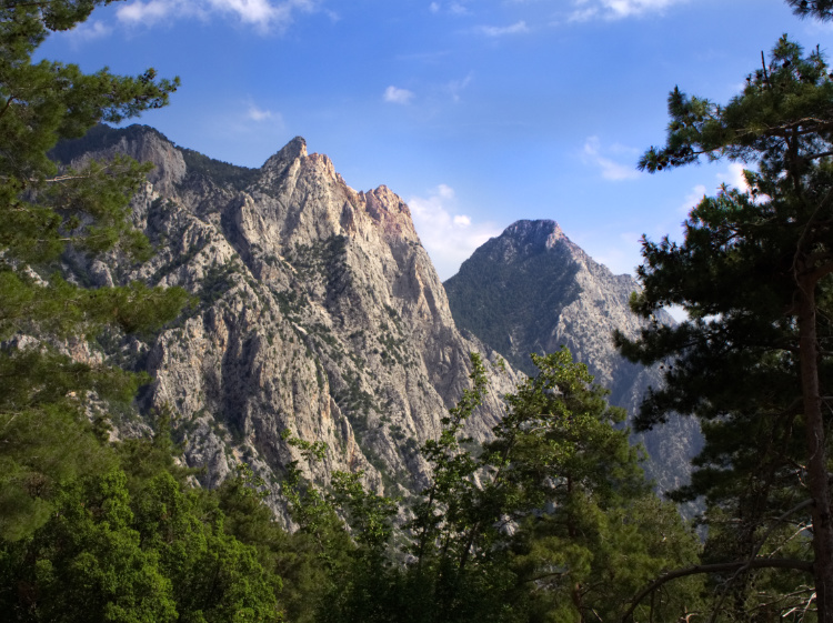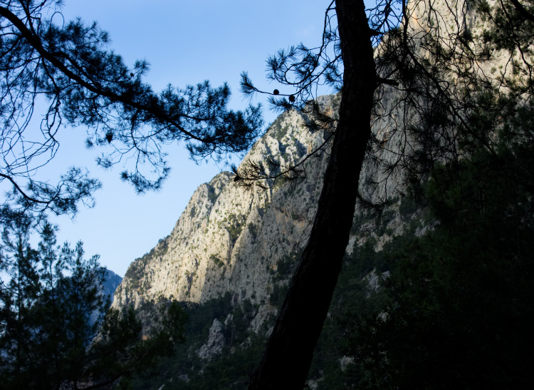 A warm wind. Up through fine-leaved myrtle, the path strewn with last autumn’s fallen leaves. Out across a dry, grassy saddle, the climb from sea level to 1,000 metres steady, the cloud building. Up another, steeper, 500 metres. A dramatic amphitheatre of glaciated rock walls, jagged pinnacles and sheer peaks. Scree slopes and polished boulders. The lightness of plane trees. The dark, felted green of pines and cedars. The view from the rocky summit of Hüdacik Range is sublime. We gaze in awe at the flat-topped ridge of Bozburun, the conical Ovacik, Beldibi canyon, the beach and the wind-rippled sea.