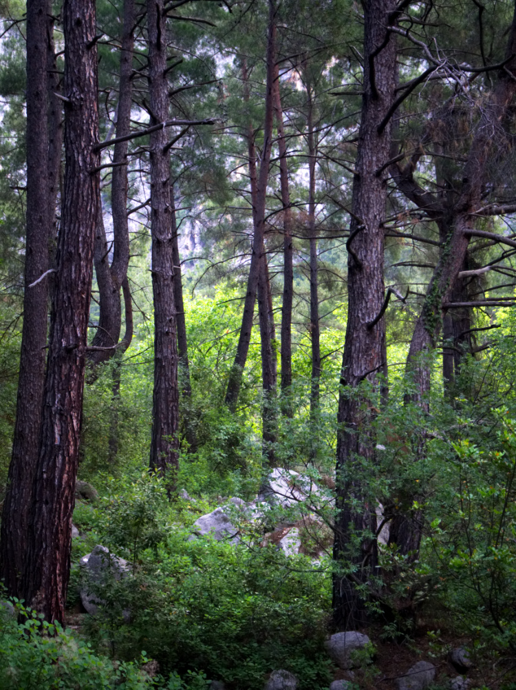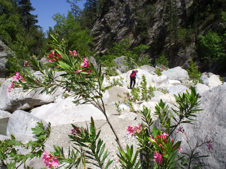 An omelette and a coffee to revive us then out into the warm afternoon. Across summer pastures and along an old migration route down the Göynuk valley, through pine forests, across the river and in and out of Göynuk gorge. The twitter of small songbirds. Pools of pale green water, waterfalls and a water-worn canyon with sheer, pale grey cliffs. Boulder hopping and scrambling around landslides and fallen trees. Occasionally catching a glimpse of the far-off distant sea. On and on through the long afternoon until, eventually, we hear the sound of people at play in the lower pools of the gorge close to town.