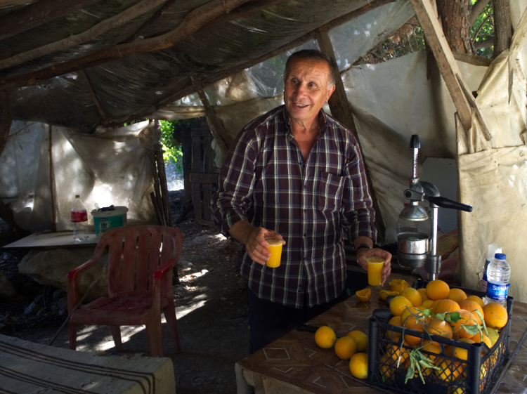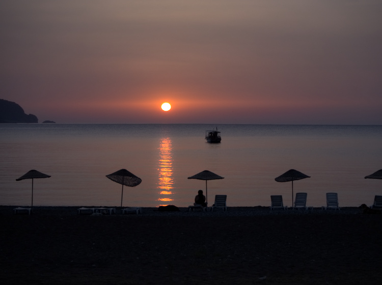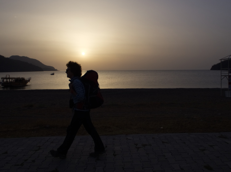 The sun rising out of the sea, the morning glowing bright orange. A woman already lying on one of the sun lounges on the beach and being served tea by a waiter from the cafe across the road. Reluctantly we trade a rest day here for ‘two in the bush’ later on and walk out of town, past the restaurants built over the river and the orange and pomegranate orchards of Adrasan.