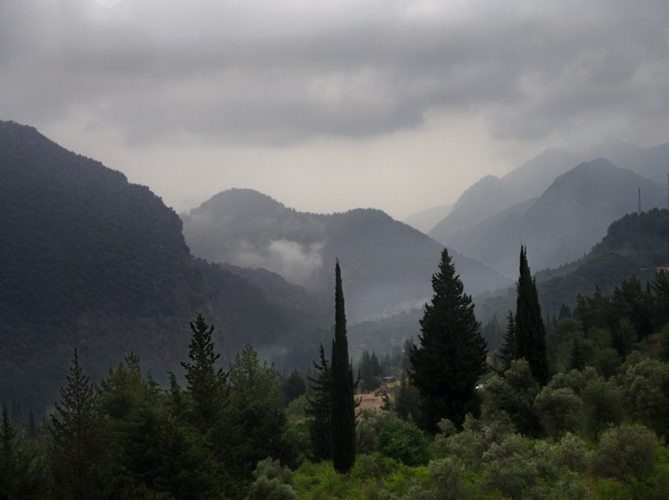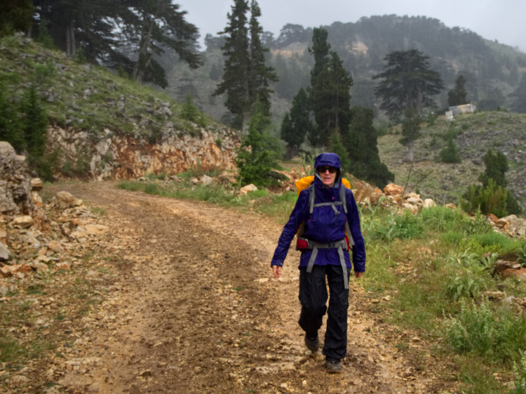 Up to the high pass at 1,815 metres. The cedars in this exposed landscape are bonsai versions of the trees lower down. The mid-morning mist coming in and shrouding the barren slopes of Mt Olympos. Karstic hollows and masses of bright alpine flowers. Feeling pleased with ourselves for reaching the high point of the climb with relative ease. Thinking we had the day tamed. Then on the descent, we lose the track. At the same time, a storm breaks. We find ourselves in a steep, slippery, rocky gully, clamouring to find a way out and ruefully remembering that a day’s walk is never over until all its walking is done. Eventually, we regain the track and keep it close for the remainder of the day.