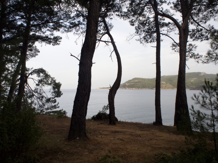 A welcome coolness in the air this morning. Walking through fragrant pines and around the rocky coast to Pirates Bay. Somewhere beyond the arc of the bay and lost in the scrub are the ruins of Melanippe, a Lycian/Roman city. This small bay was once the haunt of sea-raiders who hid in the sheltered harbour and ambushed passing ships. Today it’s home to illegal campers, including a naked couple breakfasting contentedly by the water’s edge.