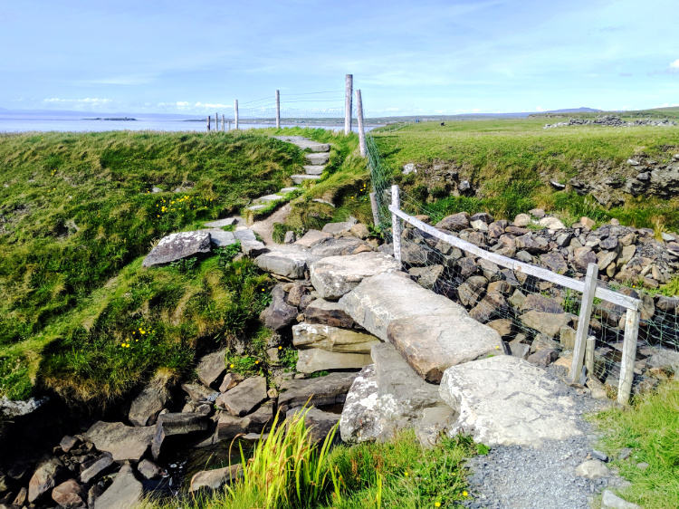 At first, the trail markers are as scant as the stories known by the locals about the Burren Way until we wind our way back to the coast, through a gentle landscape of green fields enclosed by dry stone walls that run down to the sea. An unexpected coffee at a charming artist’s studio near the village of Clahane where we sit in the sun and breathe in the green Clare landscape. A mother’s birthplace. The land from which our ancestors came. A heartland.
