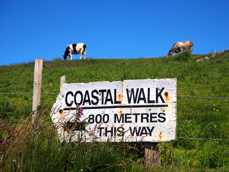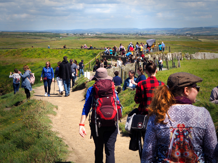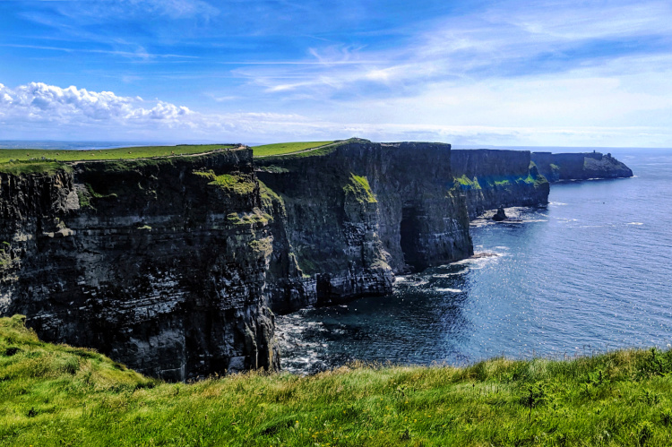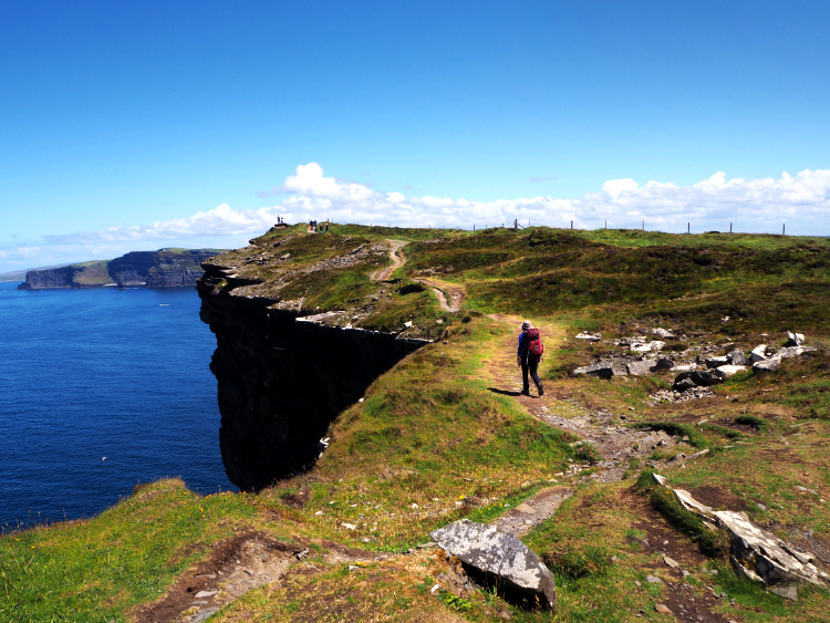 The fabled Cliffs of Moher. Hags Head, beautiful and dusky and dramatic. Seaspray and thousands of seabirds flying in and out of sea caves and whirling above the 200 metre high cliffs. Kyar, kyar, kyar they call. The sea here often roars and pounds the cliffs but not today. Today it is calm and cerulean blue. The cliffs a sea darkened, wind-eroded, moss-covered mass. Nesting seabirds; guillemots, razorbills, land-fearing kittiwakes and puffins with bright orange feet and startling orange and yellow striped beaks. A swell of people at the visitor’s centre then the wave subsiding as we walk on towards Doolan. A young woman walking the dirt track in her smart city clothes and oversized handbag stalls when the trail takes us over a stile and across a field that is home to an inquisitive bull.