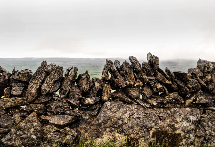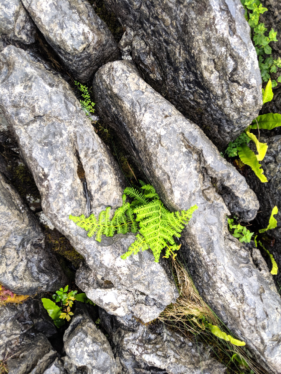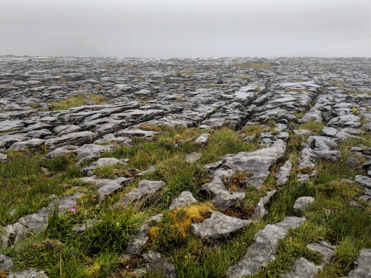 Turning east into even wilder weather before descending down to the coast. Views across to Galway City. Marshlands, the ruins of a castle, stone walls enclosing luxuriant green fields. Uphill again on a well-trod way, an old Mass path, over a stone stile and then a steep ascent up to Gleninagh Pass. Mist, low clouds and sweeping views out over rough-overgrown land to the stonewalled enclosures of the lush Feenagh Valley. On the plateau, the grykes (fissures) of the limestone pavement are a mass of wildflowers; orchids, mountain avens, bloody cranesbills and ferns. Alpine, Arctic and Mediterranean plants growing together; a rare and beautiful wild garden, even in the rain.