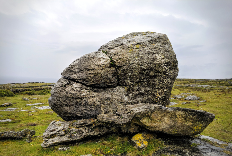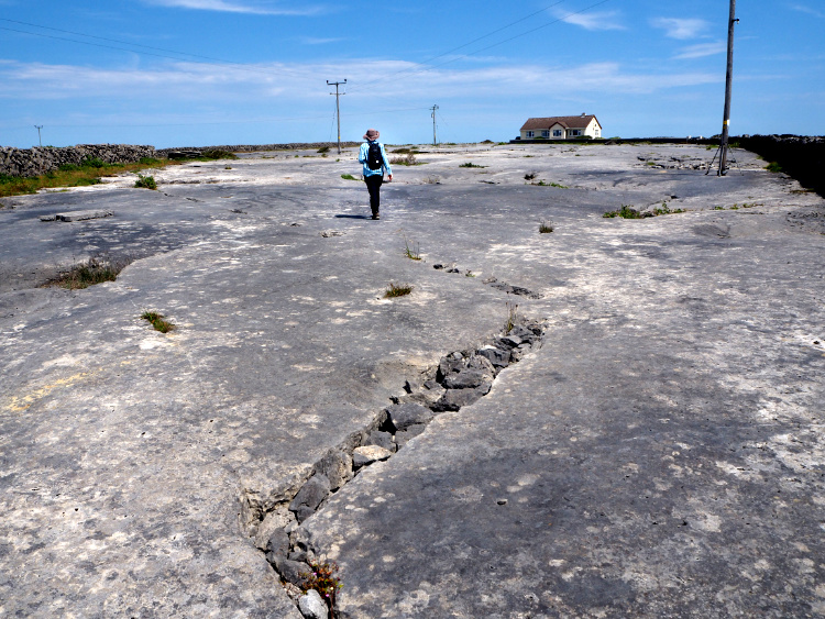 A cool breeze. The sky holding back rain. Out past Cassidys with views out over the Carran polje, a flat-floored depression hollowed out by the dissolution of rock by rainwater. It is enclosed by steep flanks made up of boulders, clay and stone deposited here by melting glaciers at the end of the last Ice Age. In periods of high rainfall, the polje holds water and becomes an ephemeral lake, a turlough. In winter, when there is water, you see wigeon ducks, teal ducks and white-fronted geese. When the waters disappear underground they wash the grasslands with calcium which reputedly makes the bone structure of the cattle strong. It’s said that a phosphorescent light sometimes hovers over the turlough at night; a will-o’-the wisp luring travellers onto dangerous land.