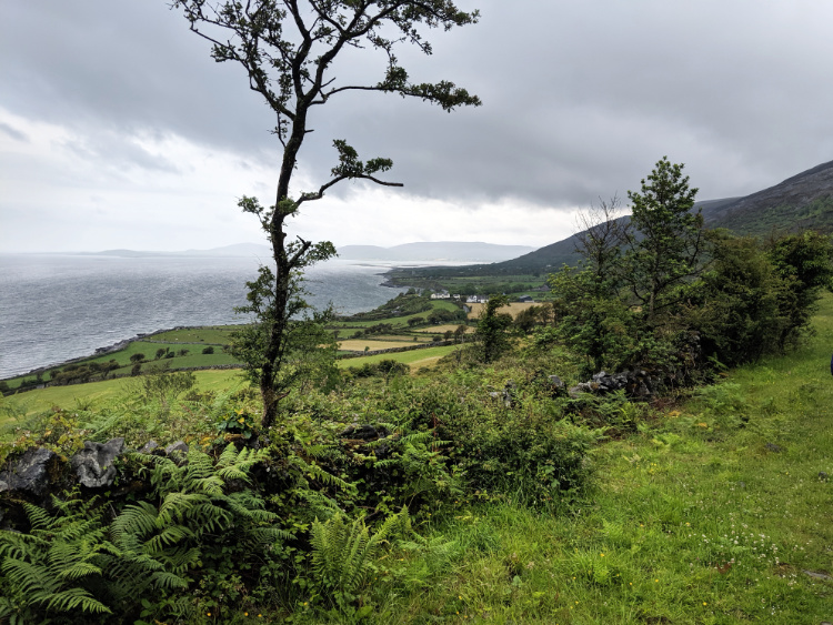 A bronze age cooking site. An early Christian fort. Down narrow, winding country lanes, a green mossy tangle of hazel woods on either side of the lane. Out into more open country. Circular stone wall enclosures. Wind-sculptured hazel trees. A nest high up in one of the few surviving old ash trees. Parknabinna wedge tomb, built around 2,000 BC on a high point on the uplands and facing south-west towards the setting sun.