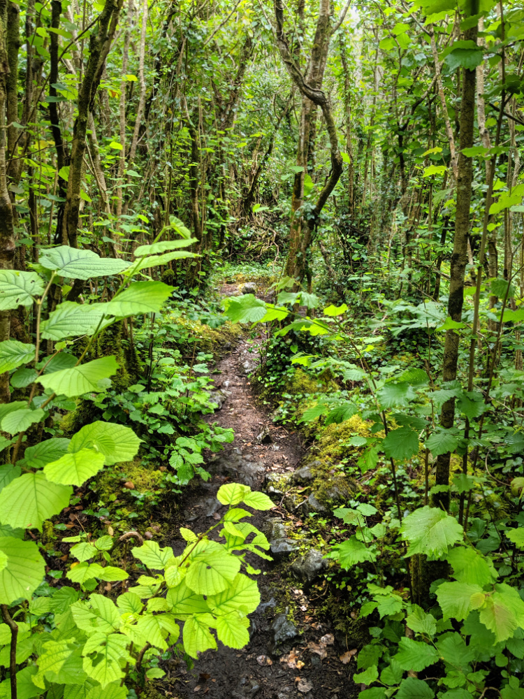 Around the shoulder of Cappanawalla Mountain before descending into greenness. Following tree-lined country byways, through verdant green woods with their Tolkien-like ferns and moss-covered trees and on to Ballyvaughan. The persistent rain keeps us walking with barely a break all day and we arrive in town bedraggled and a little spent. The charming O’Lochlainn whiskey bar and a soothing shot of one of Ireland’s best 12-year-old whiskeys work their magic and we wander contentedly out into the fading light.