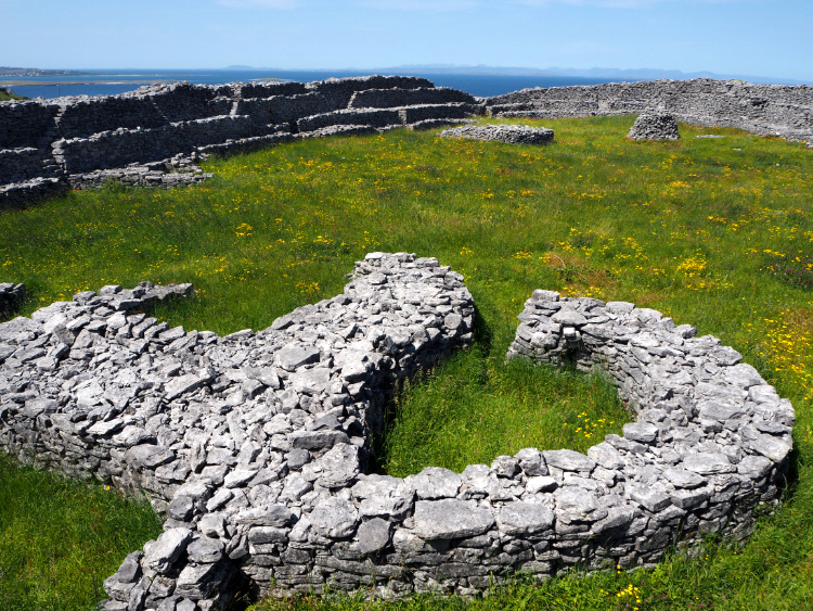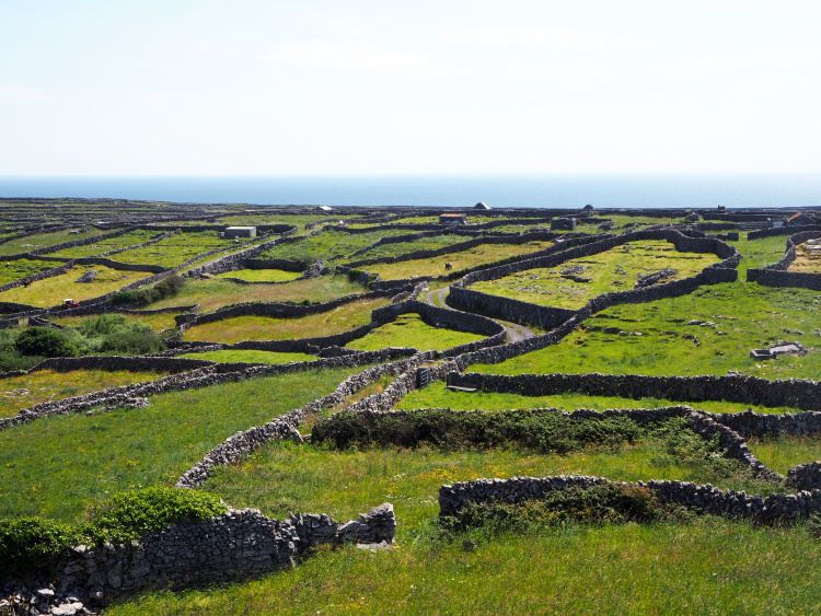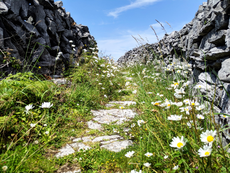 Tim Robinson describes the Aran Islands as ‘fragments of a single, low, long escarpment, a broken arm of the limestone uplands of the Burren’. County Clare is where the islands leave the mainland so we take a ferry from Doolin to Inis Meáin, the quietest and least populated of the islands, 20 kilometres out to sea. It is a wild, mythical and beautiful place. We walk the Inis Meáin Way out to Dún Fearbhaí, a fort built on high ground in the east of the island and onto Dún Chonchún in the west of the island. These two forts, homesteads to early medieval chiefs, date back to the 1st century AD. Their concentric stone walls rise to a height of six metres.