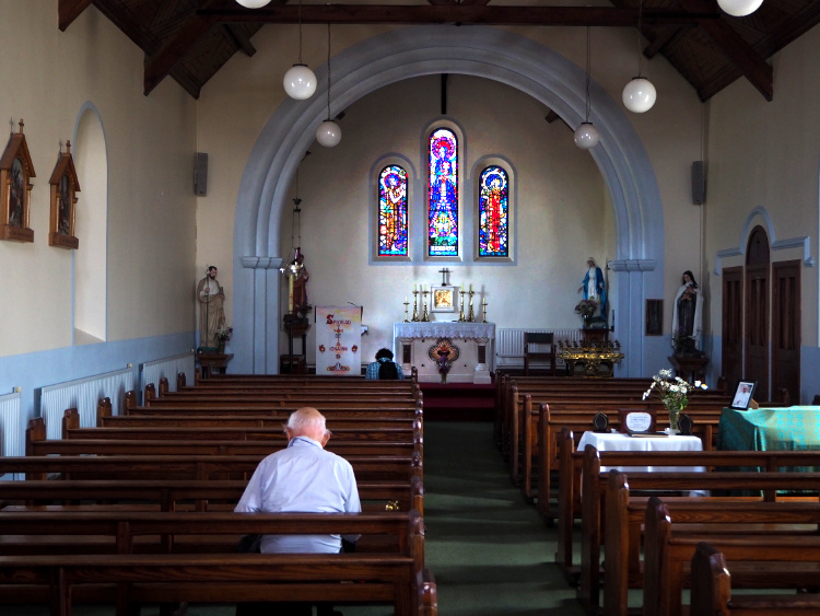 The Aran Islands lost in the mist. The sea inky. Seabirds diving for fish. The rain coming down. The sweet earthy smell of peat being burnt. Grottos sheltering virgins and sacred hearts. Following the coast road, empty of traffic until the Sunday mass crowd starts moving. The golden sand of Fanore damp now. The Caher River, the only river in the Burren that flows completely overground, emptying into the sea.