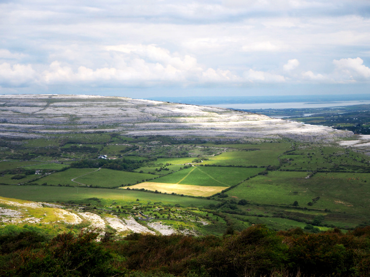 Up on to the plateau and under Slieve Elva, the highest point on the Burren, with its shale slopes extending down to meet limestone pavements and the golden sand of Fanore Beach.