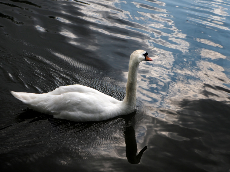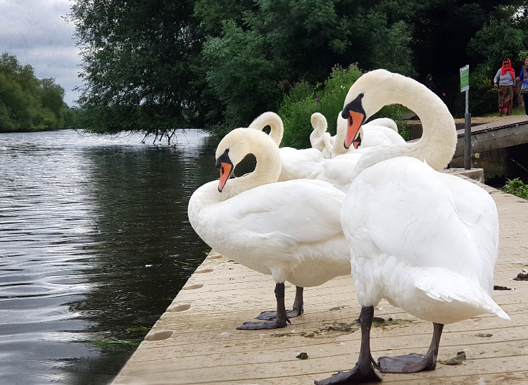 Canadian geese grace the shoreline. These birds were introduced to Britain as a potential game bird before it was realised that they fly too low and are too tame to provide good sport. A mute swan and her cygnets travel in a stately procession down the river. All the mute swans on the Thames are owned by the Queen or one of two guilds; the Worshipful Company of Vintners and the Worshipful Company of Dyers. An ancient ceremony known as Swan Upping takes place in July each year. Scarlet-uniformed Swan Uppers travel the river in traditional rowing skiffs. ‘All up’ they cry as they spot a family of swans and cygnets. They position their boats around the birds, lift them out of the water to check their health and mark them according to whether they are owned by the Queen or a guild.