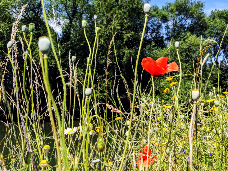 Keen to be on the Thames Path again, a year after we left it here at Folly Bridge (aptly named as it turns out), we put on our packs and blithely saunter off, charmed at once by the gaily painted canal boats drifting by and the meadows bright with orange poppies, white daisies and blue cornflowers.