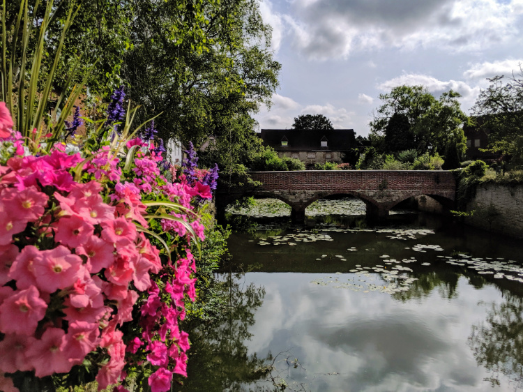 Hawks circling. A stately heron standing guard at the confluence of two rivers. The water splashed yellow and white with floating lilies. Millhouses, 14th-century chapels and riverside inns lively with people this bright summer’s evening.