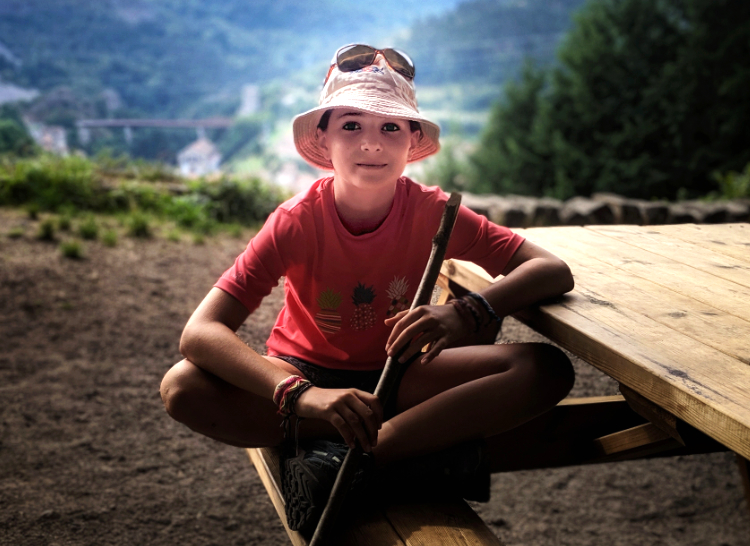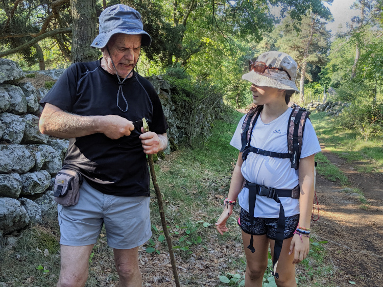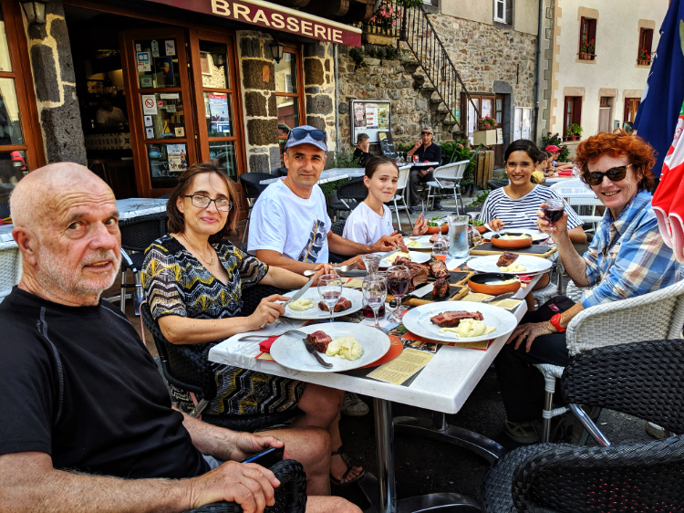 At lunch, in Saint-Chély-d’Aubrac, we are joined by Louise’s parents and sister. We celebrate five and a half delightful days on the trail together with the very best food and wine of the region, provided generously by Jean. Louise delightedly shows her parents the pages of the English words she has learnt from us and the mementoes given to her by other pilgrims, touched by the grace and endeavour of this 10-year-old girl. Her parents remark on how much more serene Louise is after her walking journey. Her papy is more pleased than he can say.
