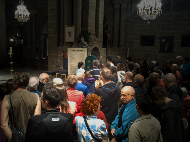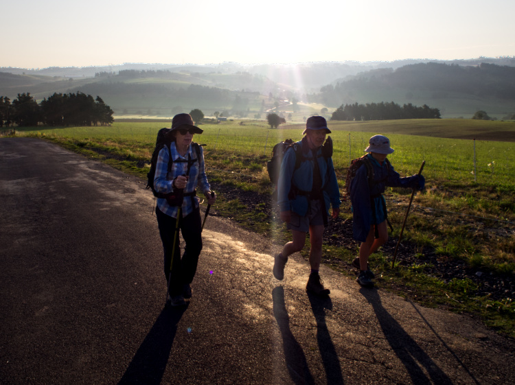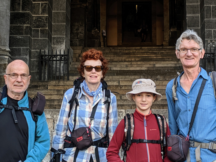 The next morning at dawn we walk down a quiet cobblestoned street and climb the steep stairs to the Cathedral; we two Australians, our French friend Jean and his 10-year-old granddaughter Louise, doing her first multi-day walk with her papy. There’s a crowd of over a hundred pilgrims gathered in the Cathedral for the bishop’s blessing. He wishes us ‘shade in the heat of the day, light in the darkness of the night and relief in tiredness’. We accept a stranger’s prayer to carry on the journey, light a candle each in memory of our mothers and step out into the day.