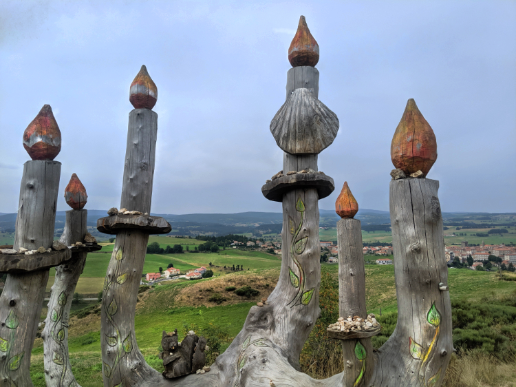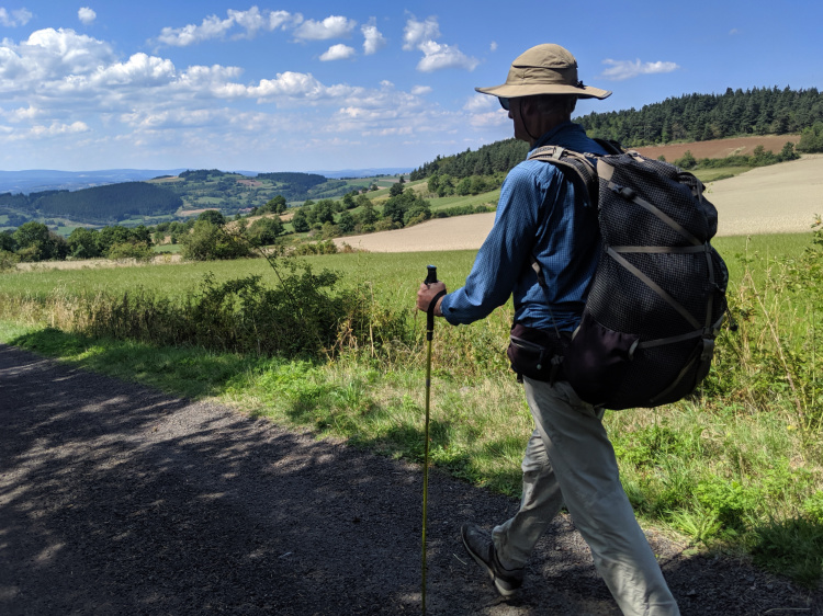 Ancient tracks lined with coppiced ash trees; fields of slate green Le Puy lentils; squat, low, thick-walled farm buildings with stone ramps for herding animals into their winter quarters. 13th-century Romanesque chapels dedicated to the patron saint of pilgrims. The day warm, almost hot. The route exceptionally well waymarked and interspersed with information boards for the inquisitive pilgrim. Louise is without walking poles so Jean sculpts a bâton for her from a length of hazelwood. Come evening, we celebrate being on this journey together over a communal dinner at L’Komposte Bar, the first of the many we will share with predominantly French-speaking pilgrims.