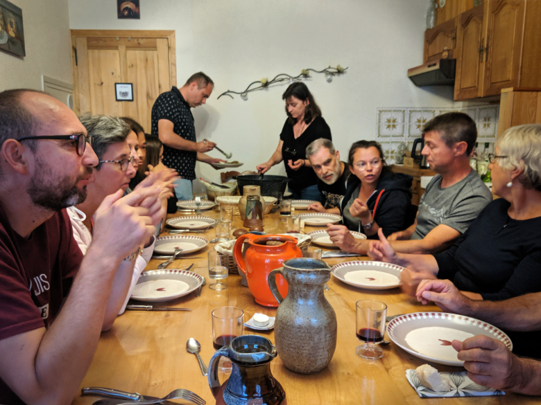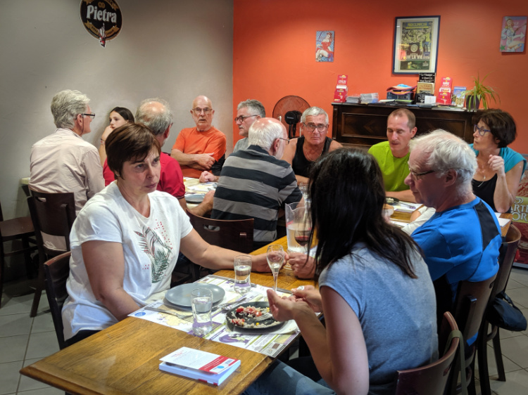 Our hosts for the evening, Sebastian and Sylvie, join the 13 pilgrims gathered around their dinner table. They offer an aperitif of kir and white wine, provide red wine to match the carefully prepared main course and a digestif of calvados to end the convivial and generous-spirited evening, the conversation wide-ranging, the tone liberal.