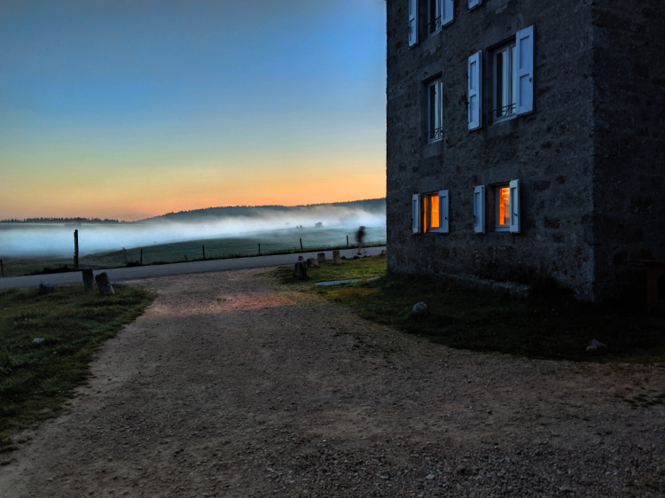 One final morning stepping out with Jean and Louise. Up through beech forests and back out onto the high plains in the most beautiful light imaginable. The rising sun flaring into a V-shape across the sky and burnishing the plains, the cattle and the drystone buildings. The most hallowed of landscapes. Birds of prey soaring in the vast sky. No-one about except us. A sculpture inscribed with the words: Dans le silence et la solitude on n’entend plus que l’essentiel (In silence and solitude one does not hear more than the essential).