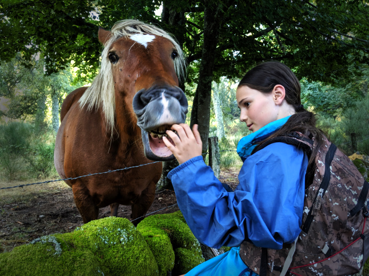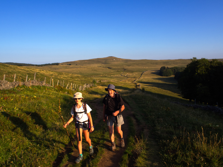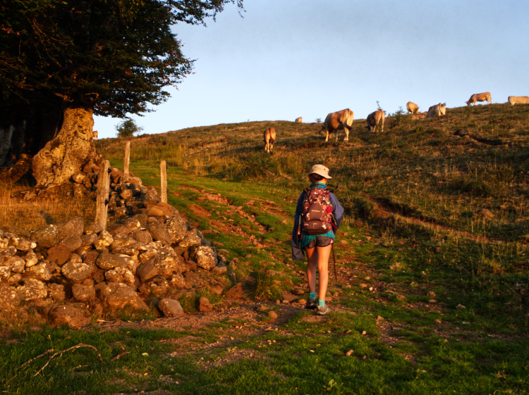 The sky is ablaze as the sun rises. We climb up to a hilltop tower and a beautiful stone chapel, all that remains of a once-grand, 13th-century castle. Into hills of beech and pine woods that are home to otters, falcons and wild salmon. Following the way of the Beast of Gévaud, a mythical wolf-like creature that raged in this area in the lead up to the French Revolution, killing hundreds of women and children before being slain by a shepherd. We shadow the Allier River as it winds its way between the ancient lava flows of the Devès Plateau, through black granite country and past farms that see nobody during the long, harsh winters.