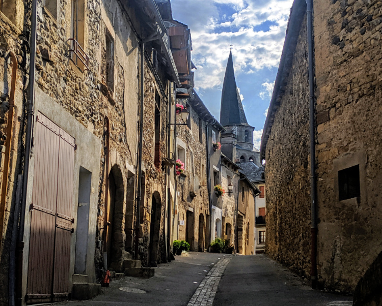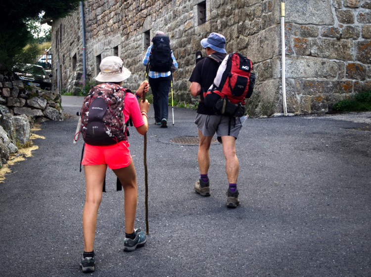 A farmer in gumboots on a bicycle, herding his cattle along an ancient droving route. Walking for part of the way on a Roman road that once connected Lyon to Toulouse. The church in Aumont-Aubrac is a former Benedictine priory founded in the 11th century. Houses with carved stone facades. Tall stone crosses with saints whose features have been erased by the vagaries of weather. Louise has now walked over 90 kilometres and despite today’s very warm weather, she skips along and falls easily into conversation with other walkers as her pace catches theirs.