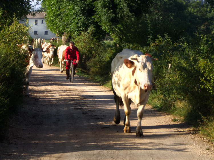 Cowbells and fighter jets are the somewhat discordant soundtrack of our afternoon. We pass through hamlets of blunt, dark stone buildings, their austerity relieved by brightly painted doors and shutters.