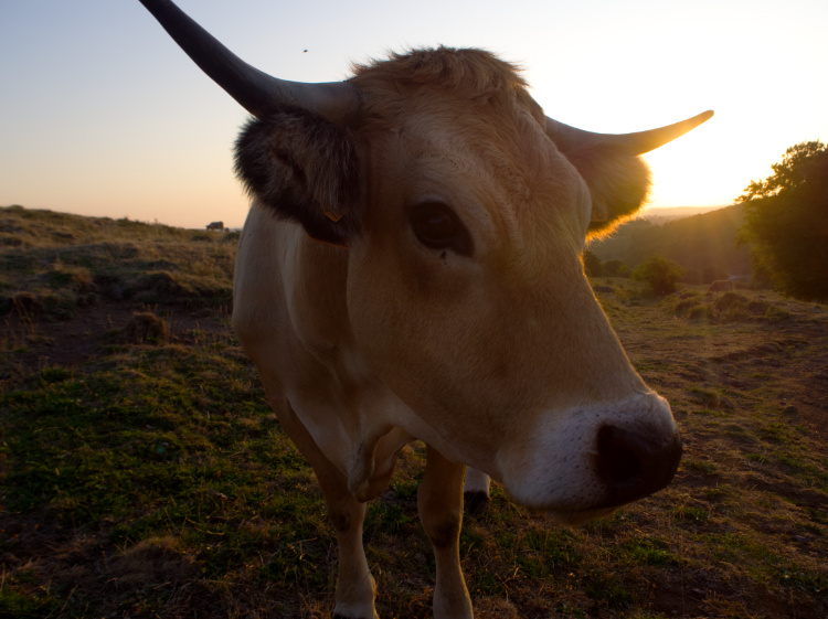 Up into the Aubrac high plains. Wild and expansive and beautiful. Purple heather blooming and the last of the daffodils and gentians. Cows still grazing the summer pastures; pretty blonde Aubrac cattle with tapered horns and velvet eyes. Shepherd’s stone bothies scattered about. Small villages with communal ovens, roman wells and stone bridges. In winter it snows heavily up here and a great silence descends.