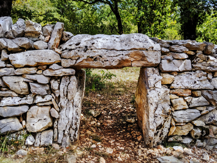 Beehive shaped drystone caselles (shelters for shepherds and flocks). Drystone walls with small openings for sheep to pass through. Solid old three-storey farmhouses and barns with grassy livestock ramps.