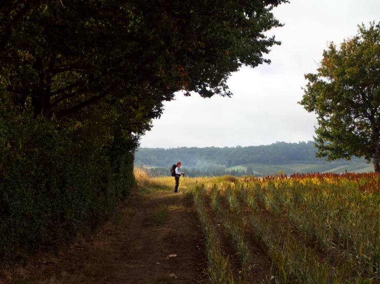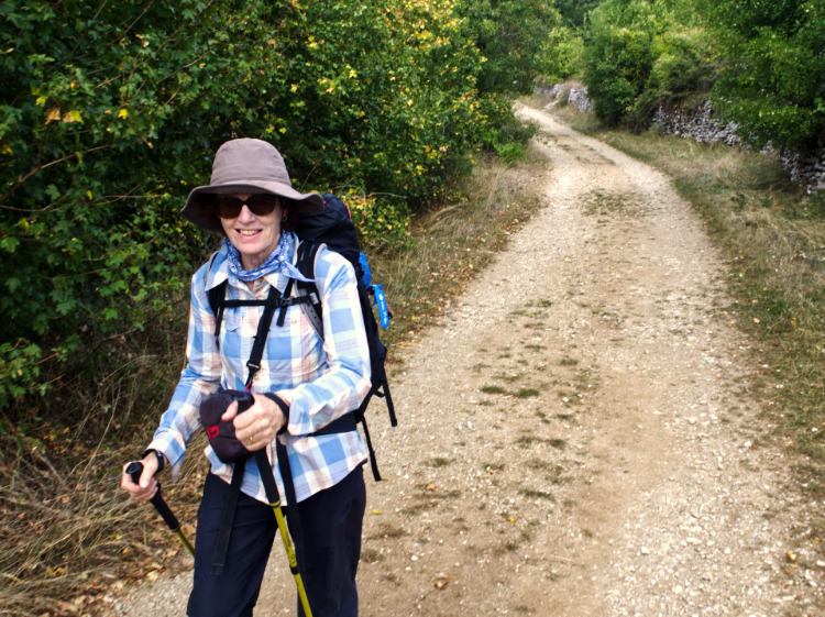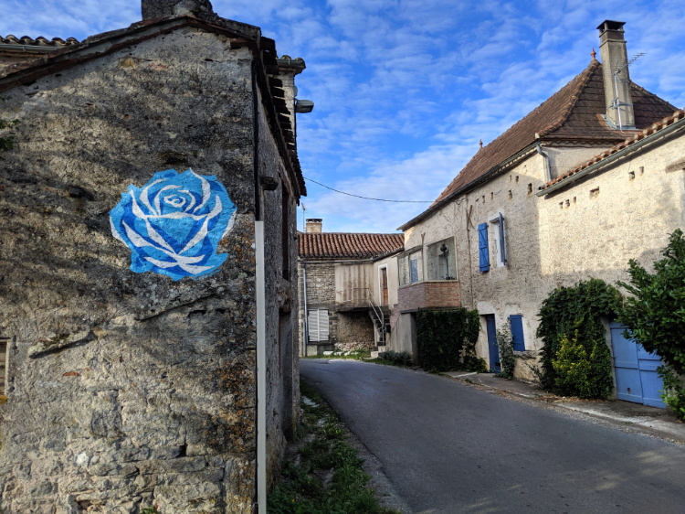 Lavender blue butterflies. Pale stone villages. A truffiére where oak and hazelnut trees are being cultivated to produce black truffles. Limestone cliffs off in the distance. Scrim cloud cover. The midday Angelus bells ringing out as we walk into Lascabanes. The morning’s walk bliss after yesterday’s rest day in Cahors and today’s easy terrain.
